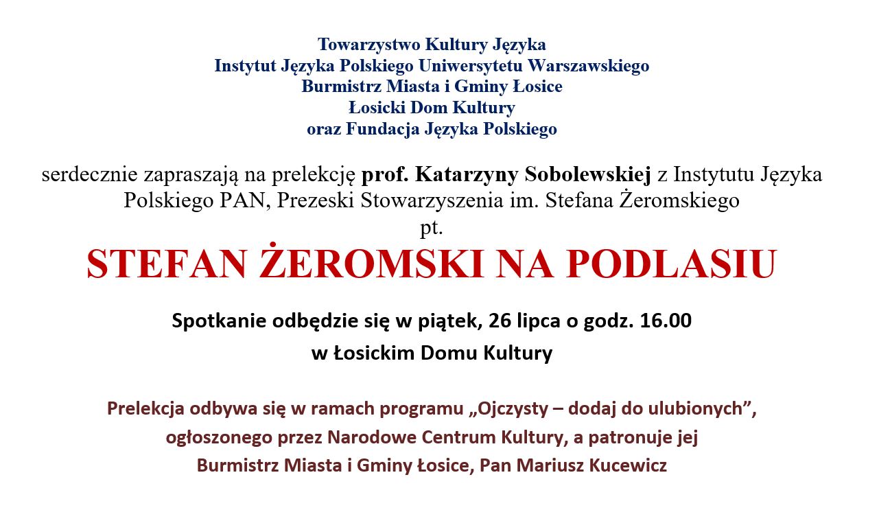26 lipca 2024 r. w Łosickim Domu Kultury Katarzyna Sobolewska wygłosi wykład „Stefan Żeromski na Podlasiu”. Będzie on oparty na zapiskach z dzienników Żeromskiego z czasów jego guwernerki w latach 1889-1890. Serdecznie zapraszamy.