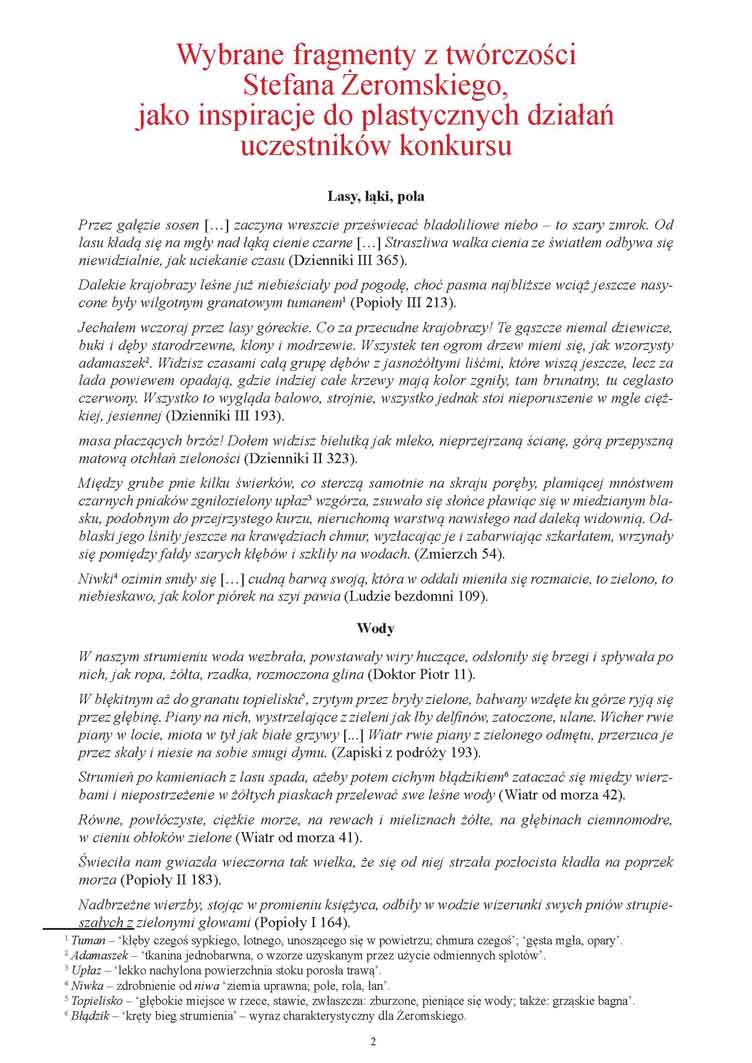 Zadanie konkursowe polegało na plastycznym odtworzeniu dowolną techniką barwną obrazów, jakie słowem wykreował w swojej prozie nasz Wielki Kolorysta.